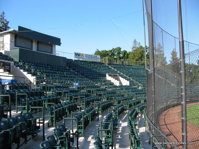 concrete grandstand behind home plate and two sections of metal bleachers -