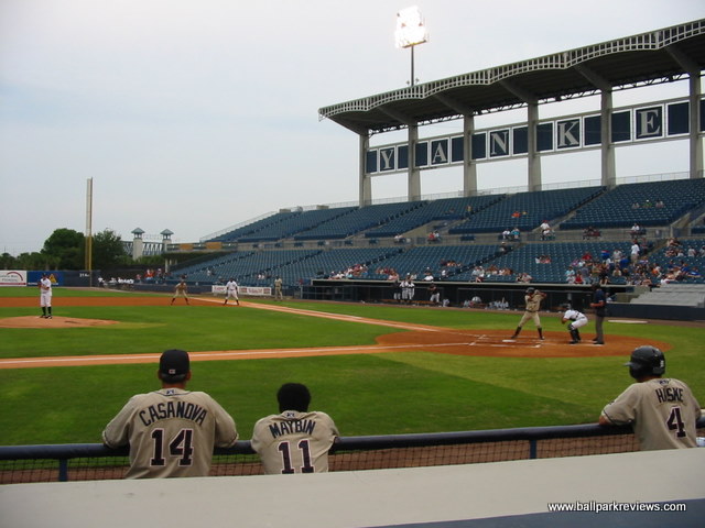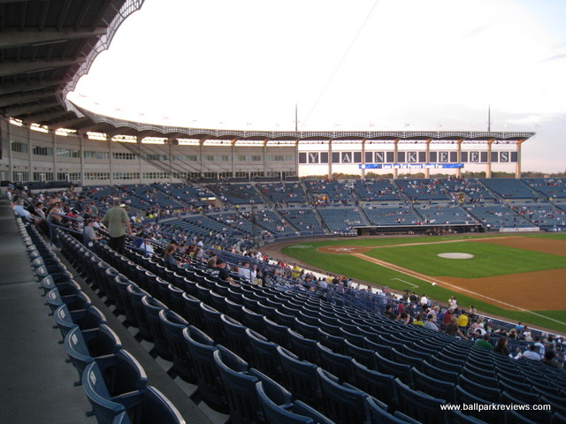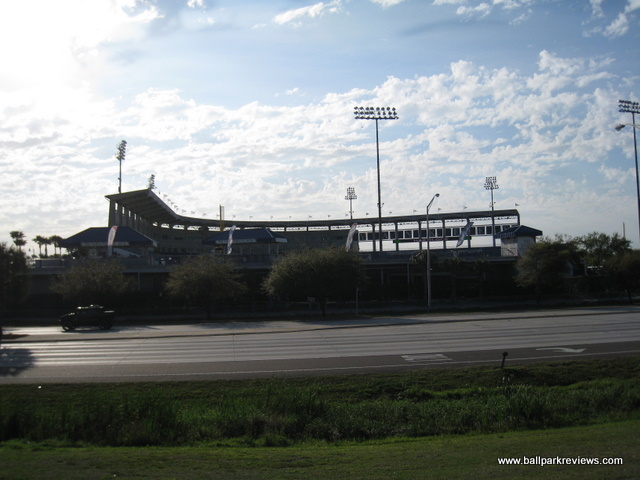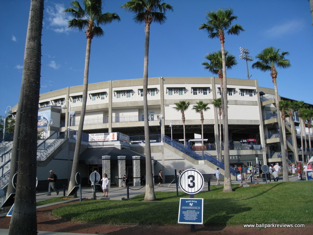 | Steinbrenner Field (originally knows as Legends Field) is a nice enough new park, but it simply feels too big for either minor league or even spring training games. Depending on which type of game you attend here, you'll get a vastly different experience. I have been to spring training games here in 2000 and 2011, and I felt more like I was at a major league park rather than a spring training facility. And have also attended a Florida State League game in 2007 in which there was just a handful of people in the park (which is the norm during the minor league season). Some people refer to Legends Field as a "mini Yankee Stadium", but frankly I don't see the resemblance beyond the blue seating and the facade. Despite being built in the era of new ballparks, it lacks some of the common features now found in other parks - most notably a concourse which overlooks the field and a gift store accessible from inside the park. But Yankee fans are there to see the players, so I doubt this fazes most of them. Seating is split into a lower level and an upper level, split by a walkway which leads to the concourse. The seats and aisles are wider than in most parks making for a more comfortable time watching the game, though many of the seats are a bit far from the field. The concourse area (located behind the seating areas) features a great selection of food items (at least for spring training games) - from ordinary ballpark cuisine to deli sandwiches, Little Caesars Pizza, Outback burgers, arepas, BBQ nachos and funnel cakes. For FSL games, only basic ballpark fare is offered. Concession prices are quite reasonable and the quality good. The atmosphere for FSL games is rather bland - the team does have a mascot, but he's useless as he hardly makes any appearances. And the team only does a couple of between inning contests. It really is about the baseball here. Steinbrenner Field is located directly across the street from Raymond James Stadium along the busy Dale Mabry Avenue. The constant buzz of traffic can be heard from inside the park, which does not make for a very peaceful setting. My biggest complaint is the traffic after spring training games. It took nearly one hour to get out of the parking lot and back onto the highway which is just a couple miles from the park. Apparently the problem was that it was a weekday afternoon and the rush hour coincided with the game letting out as I did not experience the same issue with a night spring training game. Parking is $10 for spring training games. But for FSL games, free parking is available behind the ballpark and traffic is not an issue. Steinbrenner Field was built as a spring training venue, so that is the best time to attend a game. But if you decide to go to an FSL game here, be forewarned, you'll have the place to yourself.