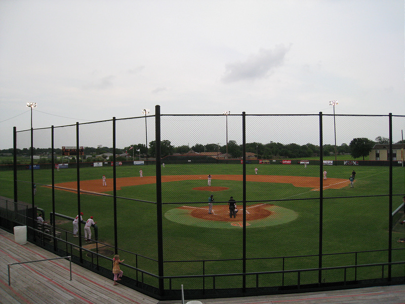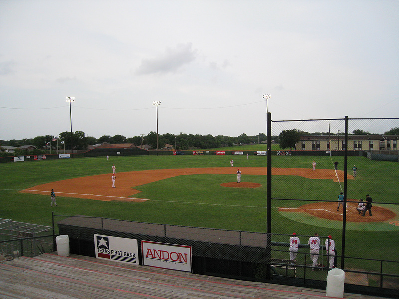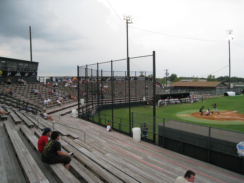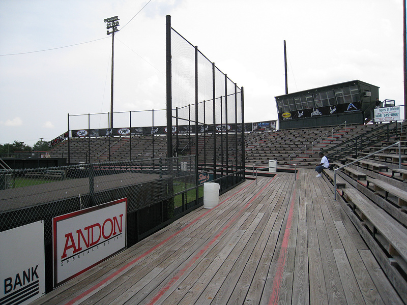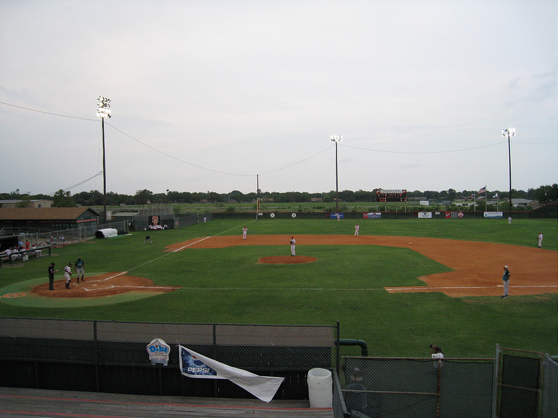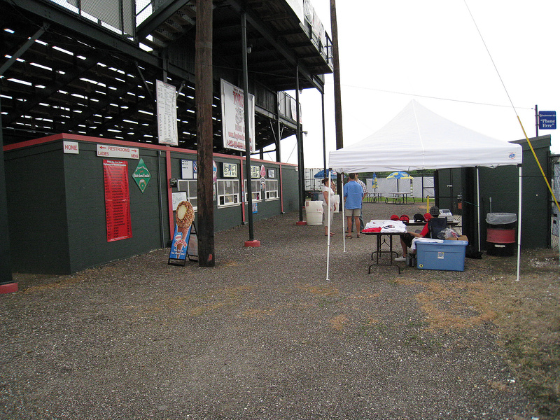 | As with most of the facilities that the Continental League has used in its first two years, Robinson Stadium is not really suitable for professional baseball. Located in a southern suburb of Houston, the ballpark is set in the middle of a neighborhood, which does make for a very serene atmosphere. Robinson Stadium is a very basic facility, comprised of just a large wooden grandstand, which is completely uncovered. All the seating is benches without backs, so bringing your own seat back is recommended. Sightlines are poor here as the netting obstructs the views from all the seats in the grandstand. The concourse area is located behind the grandstand and is also completely uncovered. It features one large concession stand and a small souvenir table. Concession options include frito pies, sausage on a stick, mozzarella sticks, fried pickles, and fried green beans. For such a small operation, the variety of food options is quite impressive. Prices are quite cheap and the quality is good. But I was most impressed with the very laid back atmosphere. There was no wacky sound effects and the fans seemed into the game (though there wasn't that many of them). Also, there was no between inning games or mascot to distract the fans. If you're not here to watch baseball, you'll be pretty bored. One other charming aspect was the two small kids who were selling bubble gum in the stands. I'm sure they weren't authorized by the team to do so, but nobody bothered them. And most fans couldn't resist buying some gum from the cute kids. My only complaint with the atmosphere is that the team didn't play the national anthem or Take Me Out to the Ballgame. The PA announcer said it was because of “technical difficulties”, but they were able to play music in between innings, so I'm not sure what the real reason was. Perhaps someone had taken the recordings home with them and not brought them back. A couple other minor complaints here – first, the tickets are priced at $8, which seems a bit high considering the seats are so uncomfortable and the quality of play is so low. Secondly, there was no programs or scorecards available. So there was no way to tell who the players were. How hard is it to just print up some roster sheets ? Attending a game at Robinson Stadium is definitely an interesting experience – it is certainly not like 99% of other minor league ballparks. I'm not sure the CBL will survive for much longer, but I was happy I got to see a game in Texas City. And in fact the CBL only lasted into the 2010 season before folding.