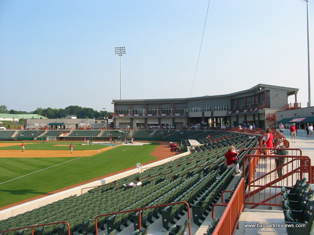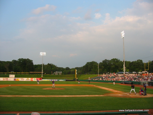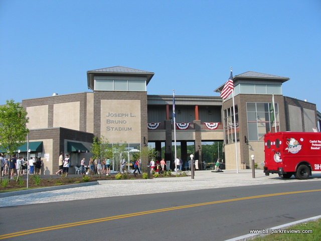 | Affiliated baseball finally returned to the Albany area in 2002 with the arrival of the Tri-City Valley Cats. While the region has supported the independent Diamond Dogs at Heritage Park , it was clear that a new park was necessary in order to lure an affiliated team. Fortunately, they didn't just go and build a generic ballpark. Bruno Stadium does follow a similar template, but has enough differences to make it unique. First, the exterior is light brown in color, not the usual red brick. Secondly, the luxury boxes are not built directly over the concourse area as in most new parks. And lastly, every seat really is close to the field as there is no middle concourse and there are only about 15 rows of seating. The setting here is unspectacular as it's set on the campus of Hudson Valley Community College. There is currently berm seating in the right field corner and fans will probably be allowed on the grass berms in the outfield after grass takes root there. Concession stands lines the concourse on both sides of the field and feature a nice array of food items including Italian sausages, Philly cheese steaks, and Chicken Speidies (an upstate NY tradition). Concession prices are quite reasonable. Off the concourse behind home plate is a small gift store. Another positive is that the parking is plentiful and free. As for the atmosphere, while it was very relaxing the first couple years, has actually gotten more annoying. There are more sound effects and they have an Uncle Sam character who tries to act as a cheerleader. The team does have a mascot (Southpaw), but he is actually unobtrusive compared to Uncle Sam. I do have two other small complaints about Bruno Stadium. First, there is not enough covering in case of rain. The only area which is covered is the entranceway behind homeplate. My second complaint is the placement of the scoreboard. Because it is left field right next to the foul pole, it is quite difficult to see for fans sitting on the third base side. I have really enjoyed my visits to Bruno Stadium - the prices are very reasonable and the fans are into the game. It has instantly become one of my favorites.