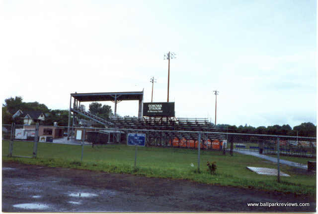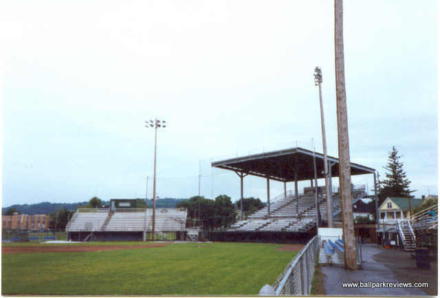 | It's really amazing that Utica was able to keep a team as long as they did (through the 2001 season). The city and surrounding area are quite depressed, the facility is substandard, and their attendance was down almost yearly. Donovan Stadium is basically just a bunch of metal bleachers. At least the ones behind home plate have a cover overhead. But that is one of the only good things about this park. The seats are too far away from the field making for bad sightlines. The concourse area is located behind home plate grandstand. The most interesting aspect of the park is the hospital that sits behind the outfield fence. While Utica's attendance hasn't been horrible, their park would seem more suitable for independent baseball than affiliated. Time finally ran out on Utica as an ownership group led by Cal Ripken Jr. purchased the team in 2002 and moved them to Aberdeen. In 2007 a four team independent league, the NY State League, began play here, but only lasted about a month before folding.