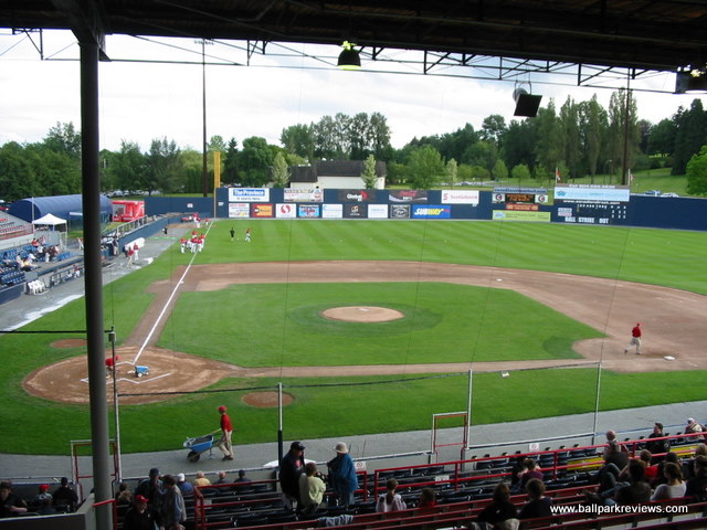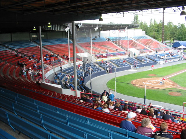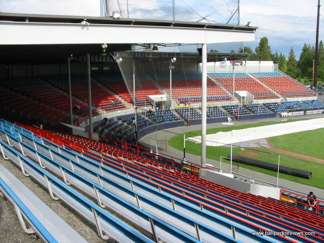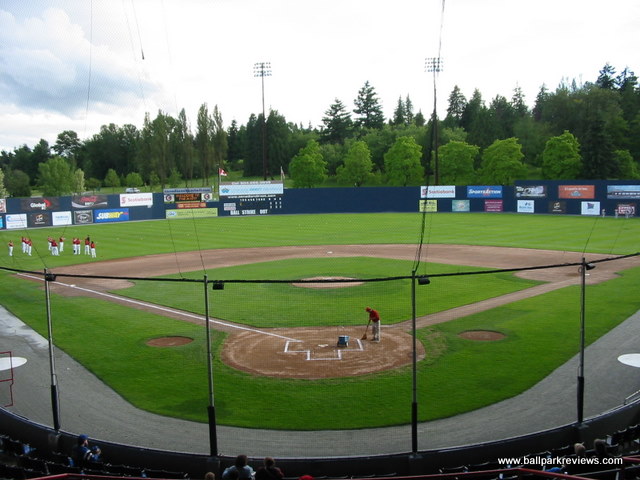 | There is just something different and refreshing about attending a minor league ballgame in Canada. As I noticed in Quebec City, the fans seem to be coming out to watch baseball and not all the other nonsense that goes on at most minor league parks. At Nat Bailey Stadium, this also holds true. Just like Quebec, Vancouver is blessed with a classic, no-frills ballpark that seems to suit the fans just fine. Located in a residential area, adjacent to Queen Elizabeth Park and south of downtown, the Nat's exterior is beautifully adorned with photos and quotes of famous ballplayers. Because of some construction on site, parking in 2007 is limited to on street, which could be a problem with large crowds. Fans enter into a brightly lit and immaculately clean concourse located underneath the grandstand. The concourse area is filled with small food kiosks, a souvenir store, and some displays of Vancouver baseball history. Concessions are a bit pricey (due to the Canadian dollar being so strong), but the quality is quite good. Along with normal ballpark fare, the Canadians offer Sushi, bratwursts, and burgers. As well, you can get a foot long hot dog which is one of the biggest (and best) I've ever had. Several portals lead from the concourse into the covered grandstand. Seating is split into two basic types - the box seats (green fold downs) and the general admission (wooden/metal benches with backs). Box seats will run you $15, which seems a but high for a short season A game, so you'll probably just want to buy the GA seats. The grandstand is quite large, so unless there is a big crowd, you'll get to sit wherever you want. A picnic area is located down the RF line and is open to the public when no groups have rented it out. In the left field area there is a small play area for kids, but since the fans here have come to watch the game, I didn't see it getting much use. As mentioned already, the atmosphere is not what you'll find at most minor league parks in the U.S. The team does do a couple between inning games and there is some music blared between innings, but there is no mascot and overall the emphasis is on baseball. And that's what the fans seem to want. Even on a cold June night, with the game running 3.5 hours long, most fans stayed until the game was over. The fans are here to watch a game and won't leave until it's over. For hardcore baseball fans, Nat Bailey is a real treat. Not only do you get a classic ballpark, but you also get a great atmosphere. It's nice to know that the American minor league experience has not seeped into Canada too much yet.