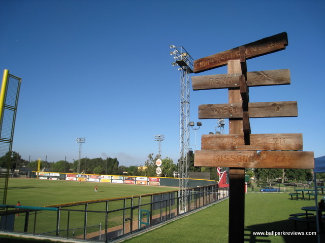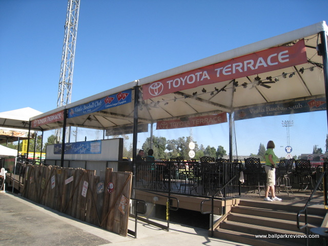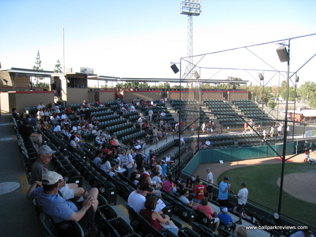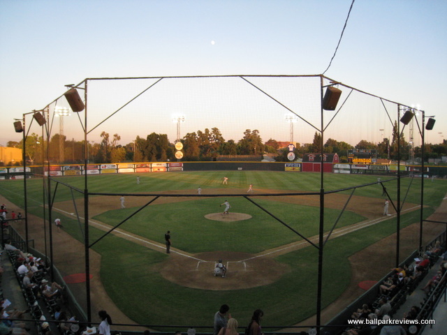| Many ballparks claim to be cozy and intimate, but none may be more so than Visalia's Recreation Park. Not only does it have one of the smallest capacities in minor league baseball, but it also has a very small amount of foul territory. This combined with a unique design and new renovations make it a great place to experience a minor league ballgame. Located just off the downtown, parking is available in small lots and along the street. All parking is free - something that is becoming less and less common. The main entrance to the ballpark is now located in the right field corner, as the biggest part of the recent renovations were a new building along the third base side. These renovations included new team offices, a new grassy berm behind the right field fence, and new box seats. The park does have a bit of a choppy feel because it wasn't all built at the same time - for example the grandstand behind home plate does not directly connect to the new third base box seats. It makes the park a bit hard to navigate, but this is just a minor complaint. New fold down seats were also installed in the original grandstand, meaning that the whole park is void of bleachers. Down the first base line, there is a large covered beer garden (known as The Watering Hole) and additional picnic area. The beer garden offers misters which run occasionally to keep fans cool - something definitely needed in the hot California summers. Perhaps because of the intimate nature of the park, the team has felt it necessary to put up netting all the way down both lines, meaning there are no clean sightlines here. The grandstand behind home plate is quite steep, however, so this is probably the best place to sit. The concourse, located behind the main grandstand (out of view of the field) and above the third base seating (in view of the field), features just three concession stands offering a rather limited array of items. Burgers, hot dogs, and nachos are all available with various toppings. In addition, pulled pork sandwiches, Italian sausages, and chicken fingers are sold. The prices are reasonable, but it is a bit ridiculous that they offer no hot dog for less than $4.50. Come on - where is the kid's hot dog for a dollar or two ? After years of being known as the Oaks, the team changed names to the Rawhide in 2009. And you really have to give the team credit for carrying out the farm theme throughout the park - this can especially be seen with the barn built into the outfield wall and the team store (known as the "Rawhide General Store"). I also appreciate that there are several reminders throughout the park of past teams that have played here - this is always a nice touch. The atmosphere seems pretty laid back here as the focus is kept mostly on the game - there were a few between inning contests and there is a mascot (Tipper the cow), but nothing to distract you too much. The one problem I did have with the atmosphere may have been as a result of the Thirsty Thursday promotion. By the end of the game, there were numerous fans yelling obscenities. Honestly, I've never heard so much swearing at a sporting event as I heard here. With no ushers or security to stop them, it carried on for at least the last three innings of the game. Despite this, I really enjoyed my visit to Recreation Park. It is unique, charming, and cozy - just a great place to catch a game on a warm summer evening in California.
