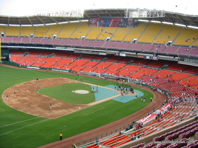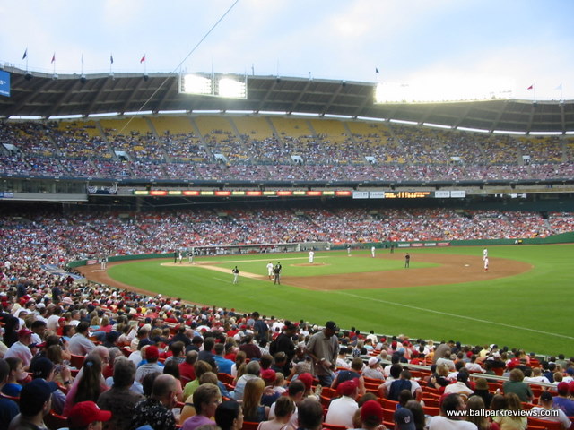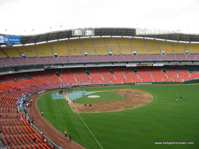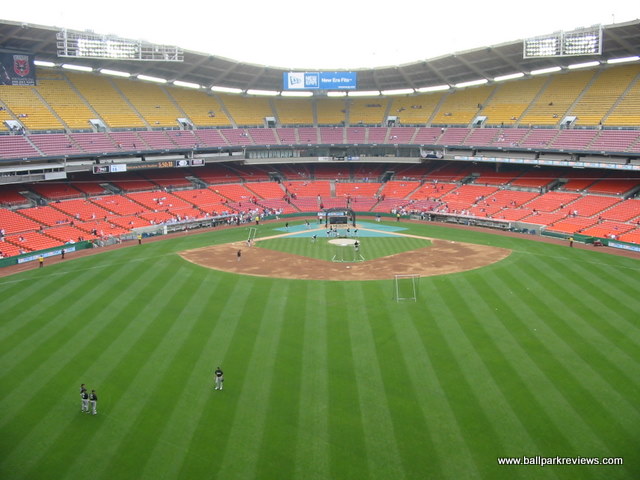 | Maybe I was expecting too much when I made my first visit to RFK Stadium in 2005. Or maybe it was just that I had forgotten that most of the circular, multi-use stadiums built in the 1960's and 1970's are not good venues to see baseball games. Or maybe I forgot that it was MLB who was still running the team and therefore just trying to make a buck. Whatever it was, I was less than impressed with the renovated RFK Stadium. Supposedly $18 million was spent to refurbish the stadium, but apparently all of it went to improving the player's comforts and none went to improving the fan experience. RFK Stadium is located on the east end of the city and is not easily accessible. Washington is a confusing city so finding the ballpark can be challenging. Large parking lots surround the stadium for which a reasonable $10 is charged. The exterior of the stadium is nothing to look at. Even the main entryway at the front of the stadium is not too inviting. Ticket booths and the team store are located in temporary trailers outside the park. Inside, the park most resembles Three Rivers Stadium or Busch Stadium. The concourses are dark and dingy besides being a bit narrow. A fair amount of temporary concession stands have been set up along the concourse, but unfortunately the variety leaves something to be desired. The only choices are italian sausages, foot long dogs, chicken tenders, and pizza. I couldn't even find a regular hot dog for sale. Concession prices were about average for a MLB stadium. The same could not be said for the souvenirs, though. A program costs $10 ! And no scorecards are sold. Fortunately one of the local newspapers hands out a free program/scorecard outside the park prior to the game. The seating at RFK is one of the positives. Even though most of the seats are old, they are quite wide and legroom is plentiful. Sightlines aren't great here, especially from the seats under the overhang of the mezzanine level. Also, foul territory is copious, so no seats are that close to the action. One of the unique features of RFK is the upper deck which varies in height - it rises up near first base and third base before dropping down behind home plate and in the outfield. A new video board was installed in the outfield, but I would have rather had them upgrade the sound system. The PA announcer was almost unintelligible and the music that was played you could hardly distinguish. Despite the negatives I encountered with the park, the fans still seem to be coming out and enjoying it. Most seem very much into the game and more cheering was heard than in some of the other new parks. RFK Stadium was only utilized as a temporary home for the Nationals until their new ballpark was built near the Anacosta River. That's a good thing since the days of these concrete cookie cutters have certainly passed. While in use, RFK certainly was near the bottom of my rankings.