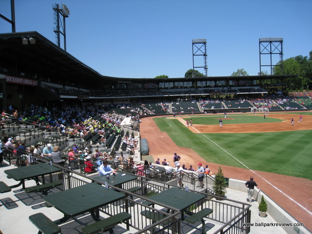 | After several years of financial haggling and construction delays, the city of Winston-Salem finally opened their new ballpark in 2010. Not that there was anything terribly wrong with their old home, Ernie Shore Field, but BB&T Ballpark is a clean, modern ballpark which allows the city to keep up with all the other North Carolina cities which have also built new minor league stadiums. BB&T Ballpark is located just to the south of the downtown and replaces a blighted neighborhood. Most of the fans park on the outfield side of the ballpark, so the team wisely decided to make the main entrance in center field. Parking seems limited for non-season ticket holders, but apparently there is enough as I haven’t heard any major complaints about this. One problem with the parking, though, is that because of how the ballpark is situated, they must climb a fairly steep hill after the game to get back to their cars. Even with the main entrance in the outfield, the façade of the ballpark is still attractive with its red brick. Inside, the ballpark is very spacious and the view of the city skyline provides a nice setting. Typical of most newer minor league ballparks, there is a full 360 degree concourse which allows fans plenty of places to roam around if they get bored. The concourse around the infield, which features several concession stands as well the pressbox, feels a bit tight in places, especially since the ceilings are not very high. Along the outfield concourse, there is a play area for kids (which features the same carousel that was at Ernie Shore Field) as well as a tiki bar for the adults. As of 2012, the park was still not 100% complete. The ticket offices as well as the team store were housed in temporary trailers near the main entrance in the outfield. Apparently a large building is supposed to be erected in right field at some point, which will feature permanent ticket offices and a larger team store. The Dash do a nice job of showing off the history of baseball in Winston-Salem as there are pictures and plaques along the concourse of famous alumni and significant baseball events in the city. Concessions here are only average at best, especially for a new ballpark. They offer several different types of hot dogs, a sub shop, and a few different varieties of fries (including garlic), but there was no BBQ to be found. Prices seemed high and the quality was lacking. They didn’t even have dipping sauce for the chicken tenders ! The atmosphere was also not to my liking, but part of that could have been due to the fact that I went to a weekday day game when the crowd was made up mostly of kids. The team has an on-field DJ (JJ) who came out every half inning to conduct some sort of contest. Fortunately they don’t go too overboard with their sound effects. There was also a mascot, Bolt, who was wondering around, though I’m not sure what he was supposed to be. BB&T Ballpark represents a new beginning for baseball in Winston-Salem and so far the fans have taken a liking to it. It certainly has everything that a modern ballpark needs, but for me, it was a bit unmemorable. Other than the view of the city skyline, there just isn’t much here that sets it apart from other new ballparks.