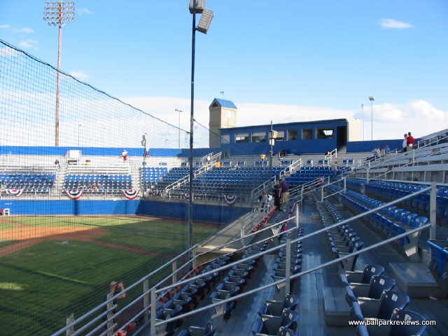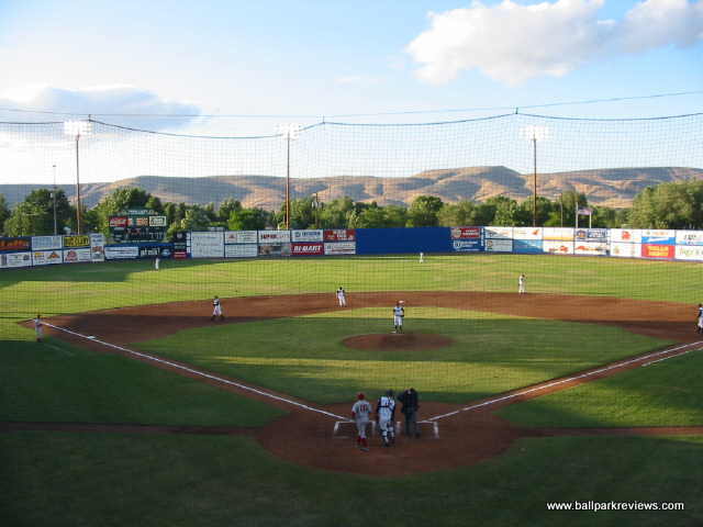 | Some ballparks can make up for a poor physical structure by having a great setting - Yakima County Stadium is one of these. Completely surrounded by rolling red (or brown) hills, the setting is quite spectacular. Unfortunately, the same can not be said about the park itself - it is cheaply built, has poor sightlines, and the seats are set high above the field. The biggest problem with the park is the backstop screen which runs from base to base, meaning there is not one clear sightline in any section of seating. Also, the seats are 10 feet above the field, presumably because the clubhouses are built beneath them. Another peculiar feature is the large black net erected behind the third base grandstand - I'm not sure what its purpose is, but it looks hideous. Fortunately, the atmosphere is pretty good here - the team does some of the typical between inning contests, but most fans seemed to be into the game and many stayed until the end even on a very cool evening. Yakima has a mascot named Boomer (how many Boomers are there ?) who stayed busy annoying fans most of the game. Concession stands are located behind the grandstand. They offer the ballpark basics as well as some made to order grill items (burgers, sausages, dogs, etc.) A small team store is also located off the concourse. One of the nicer features of the ballpark is the hand operated scoreboard in left field, which adds some charm to an otherwise boring park. In a different setting, Yakima County Stadium would probably rank lower in my book, but the great setting and ballpark atmosphere make for an enjoyable visit. Unfortunately, 2012 was the last season for the Bears in Yakima as they moved to a new ballpark in Hillsboro (OR) for the '13 season. For a panoramic of the field, click here.