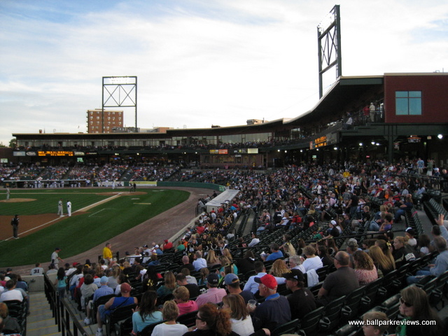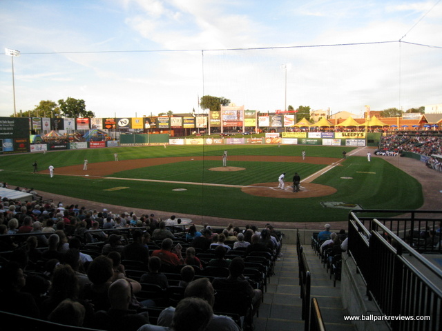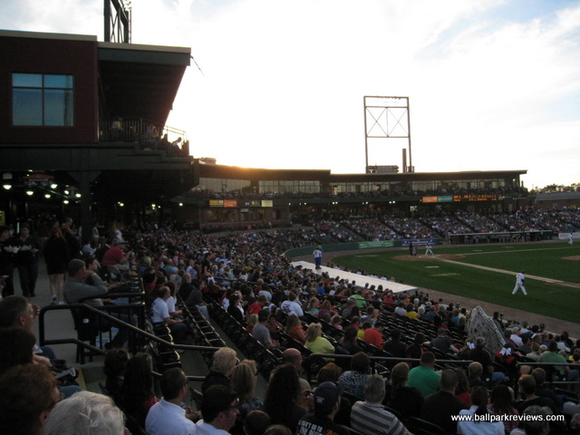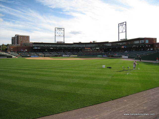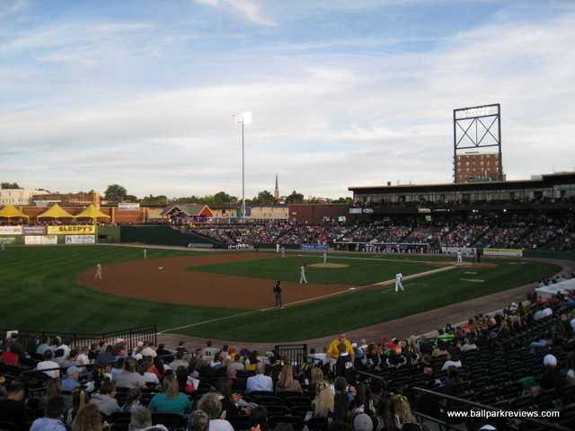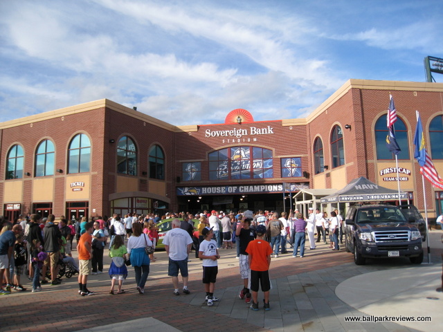 | After many years of discussion, a new ballpark finally opened in York in 2007. However, it was a month late in opening and parts of it remained unfinished throughout the inaugural season. Located just north of the downtown, the ballpark was squeezed into a city block so has a rather small footprint. Parking can be found in various small lots, both north and south of the ballpark, for $3 - $5. The exterior of the stadium is done in the familiar red brick and features a large plaza named after Brooks Robinson. Inside, the structure of the ballpark is very similar to all the rest of the Atlantic League ballparks, especially that of Lancaster's Clipper Magazine Stadium which almost feels like an identical twin. The most unique aspect of the ballpark is the "Green Monster" lookalike in left field, known as the "Arch Nemesis" (because it is adjacent to Arch Street). I don't mind them putting up a big wall, but couldn't they be a bit more original ? Why does it have to be green and have a manual scoreboard just like the one at Fenway ? Next to the "Arch Nemesis" is a huge play area for the kids, complete with a carousel. The concourse around the infield is a bit narrow, which is especially annoying on nights when there are large crowds. Seating is all fold down chairs, but the sightlines are rather poor for a new ballpark. For some reason, the architect decided to angle the seats down the lines towards the infield. This causes one of the outfield corners to be obscured for almost all fans. There is also a large picnic area in the RF corner and a berm (no grass yet) behind the right field fence. A small team store is located behind home plate, but seemed to be a bit messy. Concession choices include Italian sausages, pizza, burgers, and funnel cakes besides the normal ballpark fare. Prices and quality were about average. Just one complaint about the concessions - there doesn't seem to be enough stands as lines tend to be very long on nights when here are large crowds. As with many newer ballparks, the atmosphere is a bit over the top. There was constant sound effects while the home team was batting, which was very annoying. Some between inning games were done, but they were all the ordinary ones you'd expect to see. The team does have a mascot, but he wasn't seen much. The most amusing thing for me was watching the fans do the wave in the bottom of 9th inning while the Revolution were in the middle of the rally ! Could the fans have been that bored ? Just odd. While PeoplesBank Park is a fine ballpark, the overall atmosphere is a bit too crazy for my liking and it just feels too much like a copycat of the nearby Lancaster ballpark. Still, it fits in well with the rest of the Atlantic League ballparks.