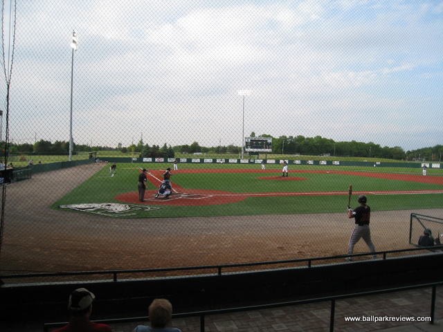 | Oestrike Stadium got its first shot at hosting professional baseball in 2009 when the Midwest Sliders (previously a traveling team in the Frontier League) moved here. Certainly this is just a one year move as the Sliders are awaiting their new home to be built in Oakland County where they will be rebranded the Oakland County Cruisers. But after attending a game here, I was left to wonder what the point was in even finding a temporary home for the Sliders. It appeared that little effort was being made to market the team and practically nobody was showing up at the games. Oestrike Stadium is located on the campus of Eastern Michigan University, right next to the football stadium. The park features a cozy little grandstand that is completely covered. All the seating is metal benches (without backs), so is certainly not the most comfortable place to watch a game. There is also a grassy berm that surrounds the park, though I don't think fans are really encouraged to use it. The field here is comprised of a Field Turf infield and grass outfield. The two areas are split by a dirt path, which almost seems to be a warning track of some sort. A simple scoreboard is located behind the fence in left field. The press box behind home plate is also a bit small as there is no room for the radio announcers. They are forced to sit at a table in front of the press box, so all the fans can hear them during the game. The concourse at Oestrike Stadium is located behind the grandstand. Concessions are sold out of a temporary trailer. No alcohol is sold and just basic food options are available - hot dogs, brats, and chicken sandwiches. Despite the very small crowd (probably less than 100) there the night I attended a game here, the atmosphere was not too depressing. Walk-up music was played for each batter, though the sound system was a bit too loud at times. There was also a few between inning contests such as the dizzy bat race and Let's Make a Deal. Strangely the team has no mascot. If you want to see a professional ballgame at Oestrike Stadium, I'm pretty sure 2009 will be your only chance. But only go if you're a hardcore baseball fan, as there is little else to distract fans here.